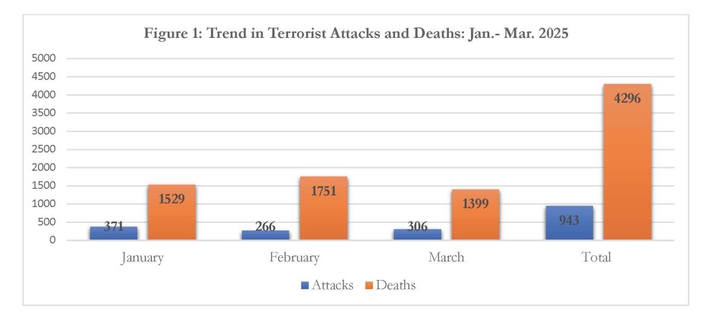 A total of 943 terrorism incidents including 37 cases of kidnapping were recorded from 1st January to 31st March 2025. The attacks resulted in 4,296 deaths across the continent. Also, 1,568 people were injured during the attacks. The data shows a fluctuation in the number of increases and decreases in both attacks and deaths from January to March 2025 (see Fig 1). Nonetheless, the total attacks and deaths recorded for Q1 2025 declined by 8% but deaths increased by 35% respectively when compared to quarter four of last years (Q4 2024). However, when compared to the same period last year (Q1 2024), the attacks increased by only 1% and total deaths also increased by approximately 33%. The general observation is that terrorism and violent extremism situation across the continent is much worse in first quarter of 2025 than they were in both first quarter and last quarter of last year (2024).