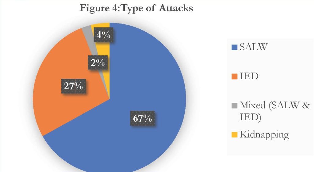 In 19 attacks, a combination of IEDs and SALWs were used, and 182 people killed and 37 cases of kidnappings were recorded, and 05 people kidnapped were killed (see fig 5). Deaths resulting from mixed use of IEDs and SALWs and Kidnapping accounted for 5% of the total deaths for the period.