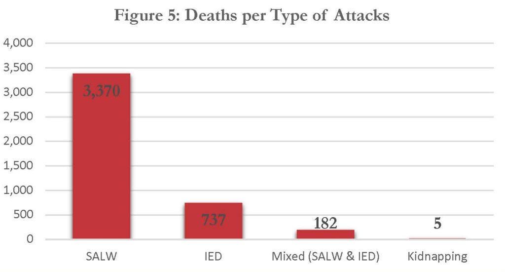 In 19 attacks, a combination of IEDs and SALWs were used, and 182 people killed and 37 cases of kidnappings were recorded, and 05 people kidnapped were killed (seefig 5). Deaths resulting from mixed use of IEDs and SALWs and Kidnapping accounted for 5% of the total deaths for the period.